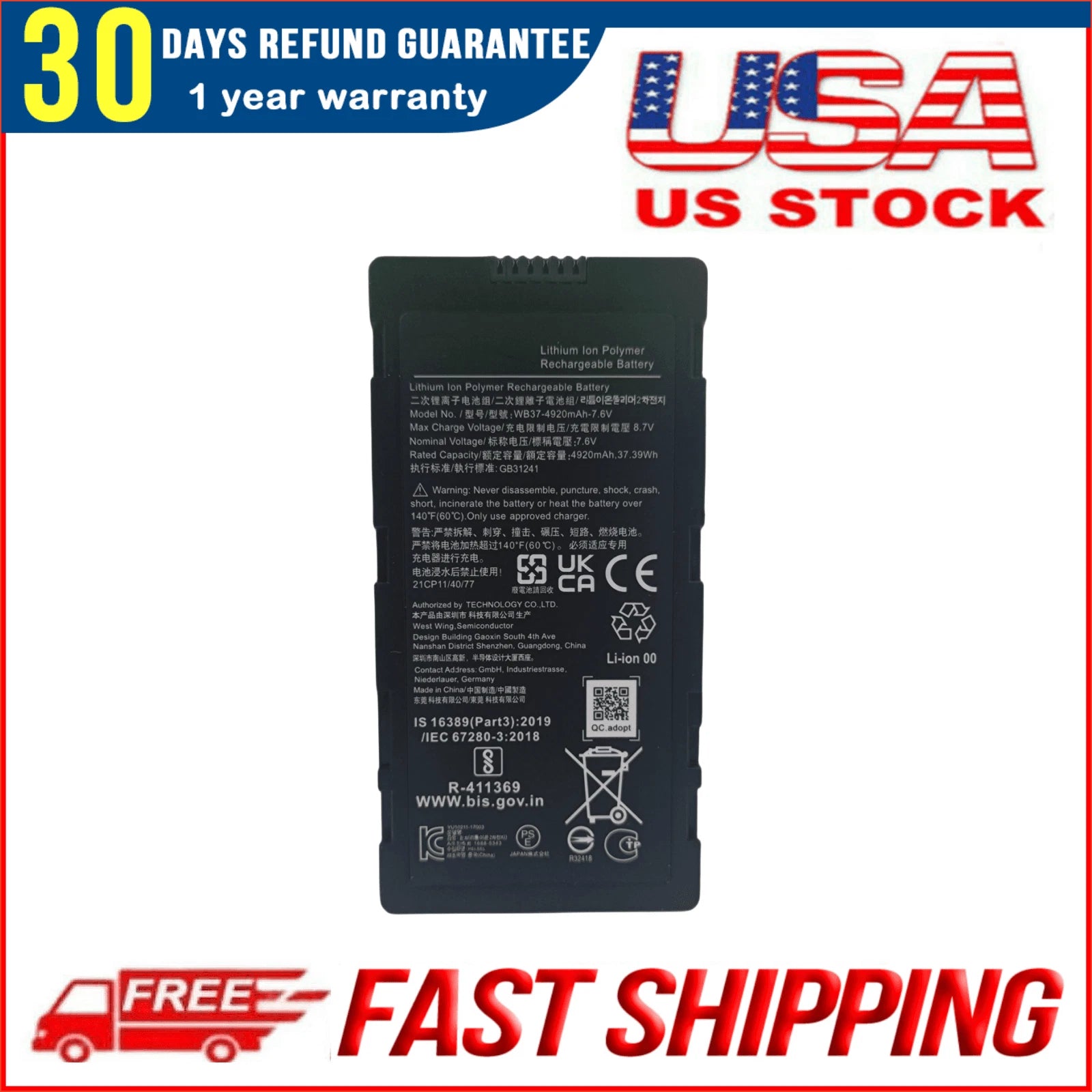 Capacity: 7.6V 4600mAh / 34.96Wh